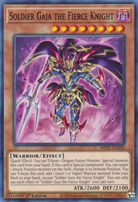 Description: (Quick Effect): You can Tribute 1 Dragon Fusion Monster; Special Summon this card from your hand. If this card is Special Summoned: You can target 1 Attack Position monster on the field; change it to Defense Position. You can Tribute this card; add 1 Level 7 or higher Warrior monster from your Deck to your hand, except "Soldier Gaia The Fierce Knight". You can only use each effect of "Soldier Gaia The Fierce Knight" once per turn.