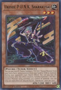 Description: You can pay 600 LP; Fusion Summon 1 "P.U.N.K." Fusion Monster from your Extra Deck, using monsters from your hand or field as material. During your opponent's turn (Quick Effect): You can pay 600 LP; immediately after this effect resolves, Synchro Summon 1 "P.U.N.K." Synchro Monster using monsters you control as material. You can only use each effect of "Ukiyoe-P.U.N.K. Sharakusai" once per turn.