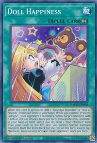 Description: When this card is activated: Add 1 "Grandpa Demetto" or "Box of Friends" from your Deck to your hand. While you control "Princess Cologne", your opponent's monsters cannot target monsters with 0 ATK or DEF for attacks. Once per turn: You can destroy 1 monster in your hand or field, and if you do, send 1 "Doll Monster" card from your Deck to the GY, also you cannot Special Summon monsters from the Extra Deck for the rest of this turn, except Xyz Monsters. You can only activate "Doll Happiness" once per turn.