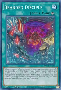 Description: When a monster effect activated by your opponent resolves while you control a Level 8 or higher Fiend Fusion Monster with 0 ATK or DEF, you can negate that activated effect. At the end of the Damage Step, if monsters with 0 ATK battled each other: You can destroy your opponent's battling monster. You can only use each effect of "Branded Disciple" once per turn.