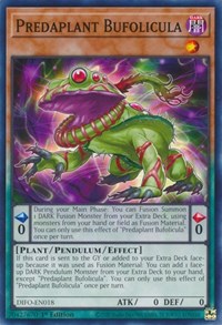 Monster Effect If this card is sent to the GY or added to your Extra Deck face-up because it was used as Fusion Material: You can add 1 face-up DARK Pendulum Monster from your Extra Deck to your hand, except "Predaplant Bufolicula". You can only use this effect of "Predaplant Bufolicula" once per turn.
