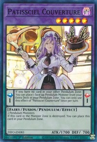 Description: Pendulum Effect If you have no card in your other Pendulum Zone: You can place 1 face-up Pendulum Monster from your Extra Deck in your Pendulum Zone. You can only use this effect of "Patissciel Couverture" once per turn.