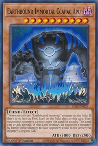 Description: There can only be 1 "Earthbound Immortal" monster on the field. If there is no face-up Field Spell on the field, destroy this card. Your opponent's monsters cannot target this card for attacks. This card can attack directly. If this card destroys an opponent's monster by battle: Inflict damage to your opponent equal to the destroyed monster's original ATK.