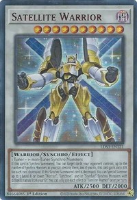 If this card is Synchro Summoned: You can target cards your opponent controls, up to the number of Synchro Monsters in your GY; destroy them, and if you do, this card gains 1000 ATK for each card destroyed. If this Synchro Summoned card is destroyed: You can Special Summon up to 3 Level 8 or lower "Warrior", "Synchron", and/or "Stardust" Synchro Monsters with different names from your GY. You can only use each effect of "Satellite Warrior" once per turn.