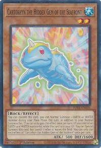 Description: You can discard this card; you can Normal Summon 1 EARTH or WATER monster during your Main Phase this turn, in addition to your Normal Summon/Set. (You can only gain this effect once per turn.) If you control an EARTH and WATER monster(s), while this card is in your GY: You can Special Summon this card, but banish it when it leaves the field. You can only use each effect of "Cartorhyn the Hidden Gem of the Seafront" once per turn.