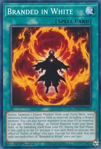 Description: Fusion Summon 1 Fusion Monster from your Extra Deck, using monsters from your hand or field as material, including a Dragon monster. You can also banish monsters from your GY as material, if you use "Fallen of Albaz" as Fusion Material from your hand, field, or by banishing itself from your GY. During the End Phase, if this card is in the GY because it was sent there to activate the effect of "Fallen of Albaz" this turn: You can Set this card. You can only use each effect of "Branded in White" once per turn.