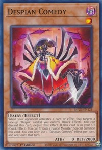 Description: When your opponent activates a card or effect that targets a face-up "Despia" card(s) you control (Quick Effect): You can discard this card; negate that effect. If this card is in your GY (Quick Effect): You can Tribute 1 Fusion Monster; Special Summon this card. You can only use 1 "Despian Comedy" effect per turn, and only once that turn.