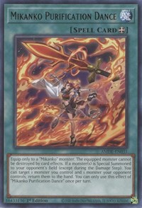 Description: Equip only to a "Mikanko" monster. The equipped monster cannot be destroyed by card effects. If a monster(s) is Special Summoned to your opponent's field (except during the Damage Step): You can target 1 monster you control and 1 monster your opponent controls; return them to the hand. You can only use this effect of "Mikanko Purification Dance" once per turn.