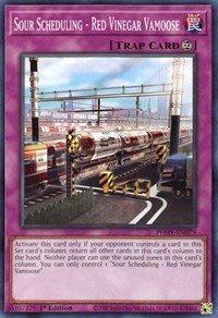 Description: Activate this card only if your opponent controls a card in this Set card's column; return all other cards in this card's column to the hand. Neither player can use the unused zones in this card's column. You can only control 1 "Sour Scheduling - Red Vinegar Vamoose".