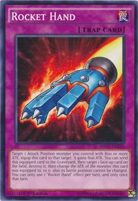 Description: Target 1 Attack Position monster you control with 800 or more ATK; equip this card to that target. It gains 800 ATK. You can send this equipped card to the Graveyard, then target 1 face-up card on the field; destroy it, then change the ATK of the monster this card was equipped to, to 0, also its battle position cannot be changed. You can only use 1 "Rocket Hand" effect per turn, and only once that turn.