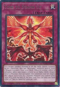 Description: If a Dragon Synchro Monster is on the field: Special Summon up to 2 monsters, that are "Resonator" monsters and/or Level 1 Dragon monsters, from your Deck. When a monster effect is activated, while you control a Level 10 or higher DARK Dragon Synchro Monster: You can banish this card from your GY; negate that effect, and if you do, 1 Synchro Monster you control gains 2000 ATK until the end of the next turn. You can only use each effect of "Time to Stand Up" once per turn.