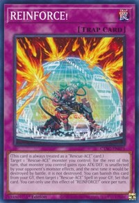 Target 1 "Rescue-ACE" monster you control; for the rest of this turn, that monster you control gains 1500 ATK/DEF, is unaffected by your opponent's monster effects, and the next time it would be destroyed by battle, it is not destroyed. You can banish this card from your GY, then target 1 "Rescue-ACE" Spell in your GY; Set that card. You can only use this effect of "REINFORCE!" once per turn.