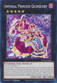 You can detach 1 material from this card, then target 1 Level 5 monster in either GY; Special Summon it to either field. If a face-up Level 5 monster you control is destroyed by battle, or leaves the field by an opponent's card effect, while you control this monster: You can add to your hand or Special Summon, 1 Level 5 monster from your Deck. You can only use each effect of "Imperial Princess Quinquery" once per turn.
