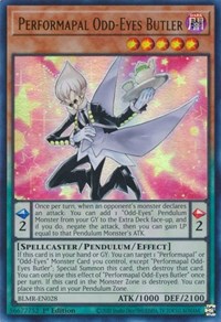 If this card is in your hand or GY: You can target 1 "Performapal" or "Odd-Eyes" Monster Card you control, except "Performapal Odd-Eyes Butler"; Special Summon this card, then destroy that card. You can only use this effect of "Performapal Odd-Eyes Butler" once per turn. If this card in the Monster Zone is destroyed: You can place this card in your Pendulum Zone.