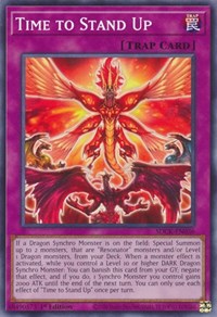 Description: If a Dragon Synchro Monster is on the field: Special Summon up to 2 monsters, that are "Resonator" monsters and/or Level 1 Dragon monsters, from your Deck. When a monster effect is activated, while you control a Level 10 or higher DARK Dragon Synchro Monster: You can banish this card from your GY; negate that effect, and if you do, 1 Synchro Monster you control gains 2000 ATK until the end of the next turn. You can only use each effect of "Time to Stand Up" once per turn.