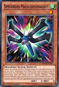 Description: Cannot be used as Synchro Material except for a Synchro Summon by its own effect. During your Main Phase, if this card is Normal or Special Summoned: You can target 1 face-up monster your opponent controls; immediately after this effect resolves, Synchro Summon 1 WIND Synchro Monster using only this card you control and that monster. You can only use this effect of "Speedroid Maliciousmagnet" once per turn.