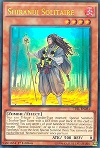 Description: You can Tribute 1 Zombie-Type monster; Special Summon 1 Zombie-Type Tuner with 0 DEF from your Deck. If this card is banished: You can target 1 of your banished "Shiranui" monsters, except "Shiranui Solitaire", or up to 2 instead if "Shiranui Style Synthesis" is on the field; Special Summon them. You can only use each effect of "Shiranui Solitaire" once per turn.