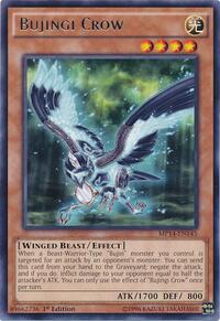 Description: When a Beast-Warrior-Type "Bujin" monster you control is targeted for an attack by an opponent''s monster: You can send this card from your hand to the Graveyard; negate the attack, and if you do, inflict damage to your opponent equal to half the attacker''s ATK. You can only use the effect of "Bujingi Crow" once per turn.