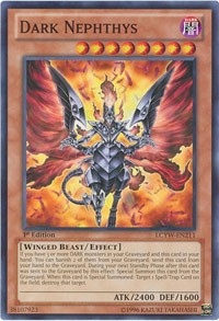 Description: If this card is in your hand and there are 3 or more DARK monsters in your Graveyard, you can remove from play 2 of them to send it to the Graveyard. If this card is sent to the Graveyard by this effect, Special Summon it during your next Standby Phase. When this card is Special Summoned, destroy 1 Spell or Trap Card.