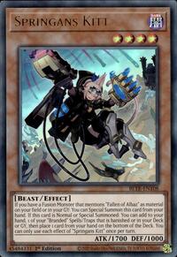 Description: If you have a Fusion Monster that mentions "Fallen of Albaz" as material on your field or in your GY: You can Special Summon this card from your hand. If this card is Normal or Special Summoned: You can add to your hand, 1 of your "Branded" Spells/Traps that is banished or in your Deck or GY, then place 1 card from your hand on the bottom of the Deck. You can only use each effect of "Springans Kitt" once per turn.