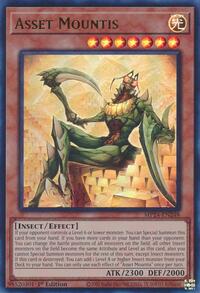 Description: If your opponent controls a Level 6 or lower monster: You can Special Summon this card from your hand. If you have more cards in your hand than your opponent: You can change the battle positions of all monsters on the field, all other Insect monsters on the field become the same Attribute and Level as this card, also you cannot Special Summon monsters for the rest of this turn, except Insect monsters. If this card is destroyed: You can add 1 Level 8 or higher Insect monster from your Deck to your hand. You can only use each effect of "Asset Mountis" once per turn.
