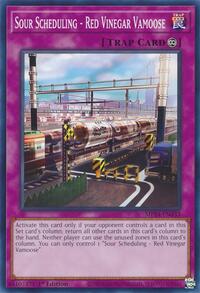Description: Activate this card only if your opponent controls a card in this Set card's column; return all other cards in this card's column to the hand. Neither player can use the unused zones in this card's column. You can only control 1 "Sour Scheduling - Red Vinegar Vamoose".