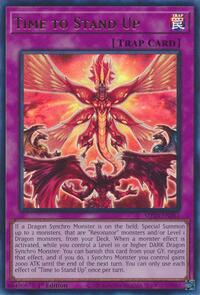 Description: If a Dragon Synchro Monster is on the field: Special Summon up to 2 monsters, that are "Resonator" monsters and/or Level 1 Dragon monsters, from your Deck. When a monster effect is activated, while you control a Level 10 or higher DARK Dragon Synchro Monster: You can banish this card from your GY; negate that effect, and if you do, 1 Synchro Monster you control gains 2000 ATK until the end of the next turn. You can only use each effect of "Time to Stand Up" once per turn.