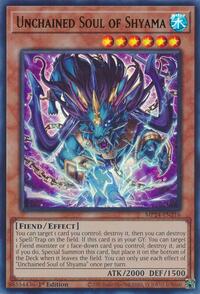 Description: You can target 1 card you control; destroy it, then you can destroy 1 Spell/Trap on the field. If this card is in your GY: You can target 1 Fiend monster or 1 face-down card you control; destroy it, and if you do, Special Summon this card, but place it on the bottom of the Deck when it leaves the field. You can only use each effect of "Unchained Soul of Shyama" once per turn.