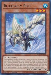 Description: If this card is sent to the GY to activate a monster effect: You can add this card to your hand. If a monster(s) is sent to your GY, except by battle, while this card is in your GY (except during the Damage Step): You can discard 1 card to the GY; Special Summon this card. You can only use 1 "Butterfly Fish" effect per turn, and only once that turn. You cannot Special Summon from the Extra Deck, except WATER monsters, the turn you activate either of this card's effects.