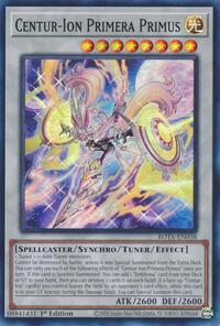 Cannot be destroyed by battle, unless it was Special Summoned from the Extra Deck. You can only use each of the following effects of "Centur-Ion Primera Primus" once per turn. If this card is Synchro Summoned: You can add 1 "Emblema" card from your Deck or GY to your hand, then you can destroy 2 cards (1 on each field). If a face-up "Centur-Ion" card(s) you control leaves the field by an opponent's card effect, while this card is in your GY (except during the Damage Step): You can Special Summon this card.