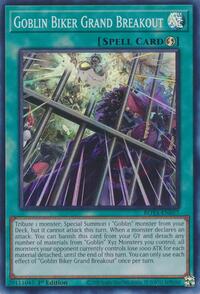Description: Tribute 1 monster; Special Summon 1 "Goblin" monster from your Deck, but it cannot attack this turn. When a monster declares an attack: You can banish this card from your GY and detach any number of materials from "Goblin" Xyz Monsters you control; all monsters your opponent currently controls lose 1000 ATK for each material detached, until the end of this turn. You can only use each effect of "Goblin Biker Grand Breakout" once per turn.