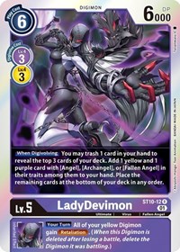 Description: [When Digivolving] You may trash 1 card in your hand to reveal the top 3 cards of your deck. Add 1 yellow and 1 purple card with [Angel], [Archangel], or [Fallen Angel] in their traits among them to your hand. Place the remaining cards at the bottom of your deck in any order.