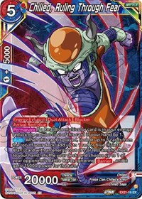 [Auto] When this card is played, look at up to 5 cards from the top of your deck, add up to 1 red or blue "Frieza Clan" card with an energy cost of 5 or less among them to your hand, shuddle your deck, and choose up to 1 of your opponent's Battle Cards, ignoring [Barrier] and it gets -15000 power for the turn.