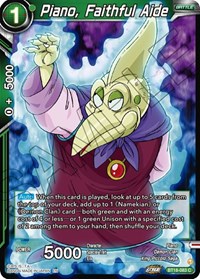 Description: [Auto] When this card is played, look at up to 5 cards from the top of your deck, add up to 1 "Namekian" or "Demon Clan" card?both green and with an energy cost of 4 or less?or 1 green Unison with a specified cost of 2 among them to your hand, then shuffle your deck.