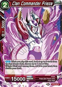Description: [Auto] When you play this card, look at up to 5 cards from the top of your deck, choose up to 1 red or blue "Frieza Clan" card among them, add it to your hand, then shuffle your deck.
