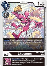 Inherited Effect: [On Deletion] If this Digimon had [Sukamon] or [Etemon] in its name, you may play 1 [Chuumon] from your trash suspended without paying the cost.