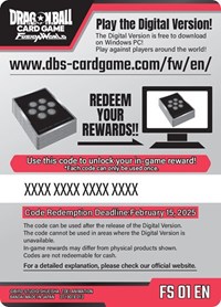 Description: This listing is not a physical item. Please keep in mind that this Code Card listing represents a digital copy of the stated item for the Dragon Ball Super Fusion World Digital Card Game. You may receive the physical Code Card. Upon purchase, please work with your specific Seller by sending them a message using the Contact Seller button on the order details in your Order History to opt in to having your Code Card code delivered digitally due to the nature of the product.