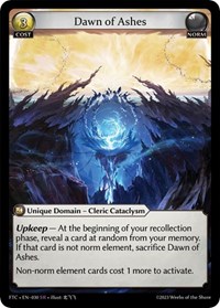 Upkeep — At the beginning of your recollection phase, reveal a card at random from your memory. If that card is not norm element, sacrifice Dawn of Ashes.