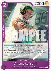 Description: [Activate:Main] DON!! -1 (You may return the specified number of DON!! cards from your field to your DON!! deck.)You may trash this Character: If your Leader has the [GERMA 66] type, play up to 1 [Vinsmoke Yonji] with a cost of 4 from your hand or trash.