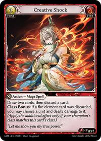 Draw two cards, then discard a card. Class Bonus: If a fire element card was discarded, you may choose a unit and deal 2 damage to it. (Apply the additional effect only if your champion's class matches this card's class.)