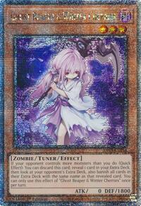 Description: If your opponent controls more monsters than you do (Quick Effect): You can discard this card; reveal 1 card in your Extra Deck, then look at your opponent's Extra Deck, also banish all cards in their Extra Deck with the same name as that revealed card. You can only use this effect of "Ghost Reaper & Winter Cherries" once per turn.