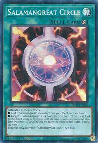 Description: Activate 1 of these effects; • Add 1 "Salamangreat" monster from your Deck to your hand. • Target 1 "Salamangreat" Link Monster you control that was Link Summoned using a monster with its same name as material; that Link Monster is unaffected by monster effects this turn, except its own. You can only activate 1 "Salamangreat Circle" per turn.