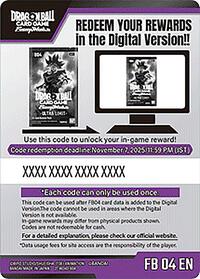 Description: This listing is not a physical item. Please keep in mind that this Code Card listing represents a digital copy of the stated item for the Dragon Ball Super Fusion World Digital Card Game. You may receive the physical Code Card. Upon purchase, please work with your specific Seller by sending them a message using the Contact Seller button on the order details in your Order History to opt in to having your Code Card code delivered digitally due to the nature of the product.