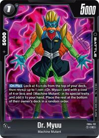 Description: [On Play] Look at 5 cards from the top of your deck, then reveal up to 1 non-"Dr. Myuu" card with a cost of 4 or less and "Machine Mutant" in its special traits and add it to your hand. Place the rest at the bottom of their owner's deck in a random order.