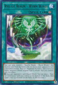 Description: You can only control 1 "Ryu-Ge Realm - Wyrm Winds". Any monster sent from the field to the GY during your opponent's turn is banished instead. "Ryu-Ge" Pendulum Monsters, and Level 10 or higher monsters whose original Type is Wyrm, that you control, gain this effect.