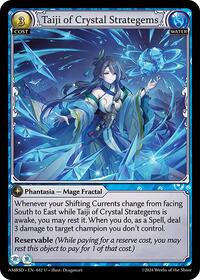 Description: As a Spell, whenever your Shifting Currents change from facing South to East while Taiji of Crystal Strategems is awake, you may rest it. If you do, deal 3 damage to target champion you don't control.