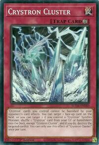 Description: "Crystron" cards you control cannot be banished by your opponent's card effects. You can target 1 face-up card on the field, or you can target 2 if you control a "Crystron" Synchro Monster; shuffle 1 "Crystron" card from your GY or banishment into the Deck, except "Crystron Cluster", and if you do, destroy the targeted card(s). You can only use this effect of "Crystron Cluster" once per turn.