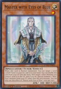 Description: When this card is Normal Summoned: You can target 1 Level 1 LIGHT Tuner in your GY; add it to your hand. You can shuffle this card from your GY into the Deck, then target 1 Effect Monster you control; send it to the GY, and if you do, Special Summon 1 "Blue-Eyes" monster from your GY, other than the sent monster. You can only use this effect of "Master with Eyes of Blue" once per turn.