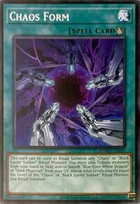 Description: This card can be used to Ritual Summon any "Chaos" or "Black Luster Soldier" Ritual Monster. You must also Tribute monsters from your hand or field and/or banish "Blue-Eyes White Dragon" or "Dark Magician" from your GY, whose total Levels exactly equal the Level of the "Chaos" or "Black Luster Soldier" Ritual Monster you Ritual Summon.