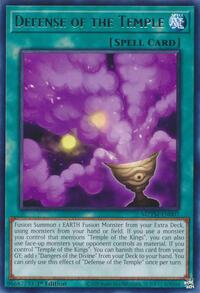Description: Fusion Summon 1 EARTH Fusion Monster from your Extra Deck, using monsters from your hand or field. If you use a monster you control that mentions "Temple of the Kings", you can also use face-up monsters your opponent controls as material. If you control "Temple of the Kings": You can banish this card from your GY; add 1 "Dangers of the Divine" from your Deck to your hand. You can only use this effect of "Defense of the Temple" once per turn.